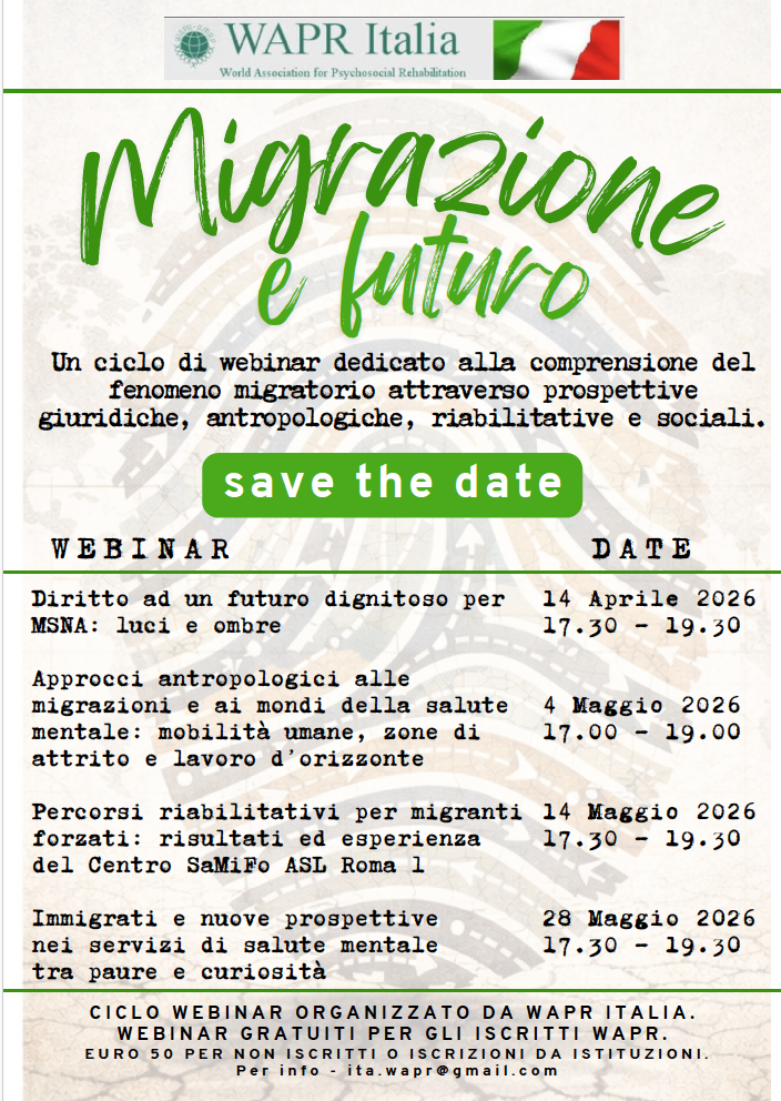 la sezione Italiana della World Association for Psychosocial Rehabilitation (WAPR), associazione che da anni promuove temi per lo svipuppo delle attività riabilitative finalizzate al recovery delle persone con esperienza di malattia mentale e al sostegno del loro diritto ad una piena cittadinanza, quest'anno sta organizzando un ciclo di 4 webinar da mettere a disposizione gratuita dei prorpi soci. Il primo sul tema dello stigma illustrando tecniche operative per ridurne l'impatto sul percorso di ripresa delle persone di cui si allega la locandina, uno sull'Intelligenza artificiale nella pratica della Salute Mentale e due sulla coprogrammazione e coprogettazione con il terzo settore verso l'innovazione del sostegno alla domiciliarità e promozione di inclusione sociale con un focus anche sulla valutazione degli esiti. Per l'iscrizione alla WAPR vedi modulo allegato o consulta il sito www.wapritalia.it Confidiamo nel tuo interesse e partecipazione